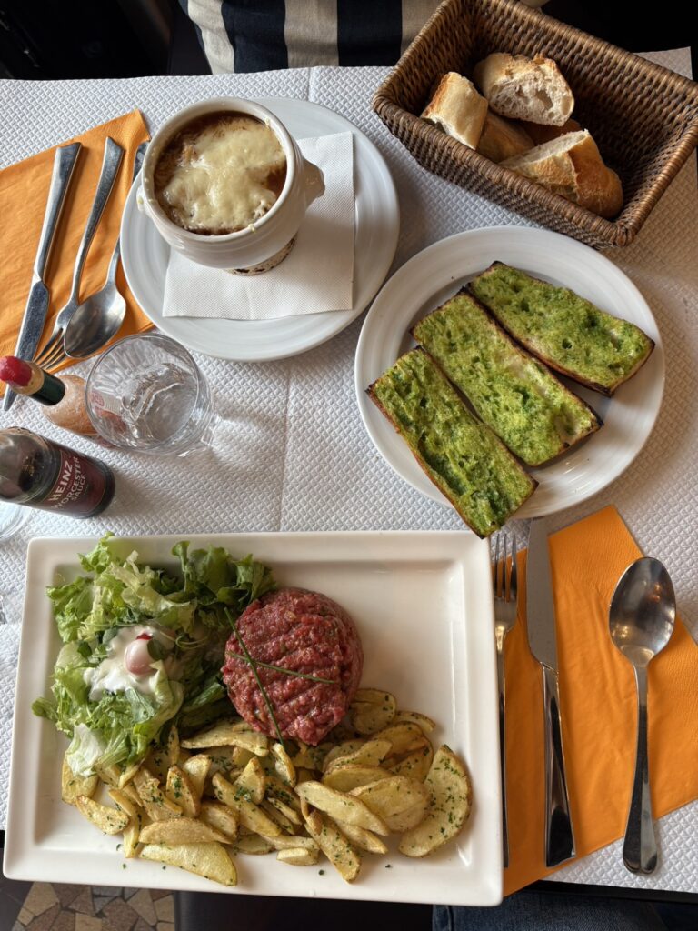 Abbesses駅の近くで夕食をとりました。レストランは『Le Relais Garçon』。価格は比較的リーズナブルです。私はタルタル(17.80€)を、友人はオニオンスープ(9.5€)とガーリックトーストを食べました。ポテトとサラダもプレートに入っていてかなりお腹いっぱいです!店員さんも親切でした。