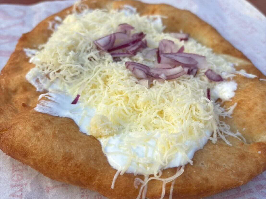 市場の前に並ぶキッチンカーで食べた屋台グルメ。ピザより分厚い生地に、チーズとサワークリームをトッピングした「ラーンゴッシュ」は外カリッ・中ふわっ!歩きながら食べるのにぴったりです。