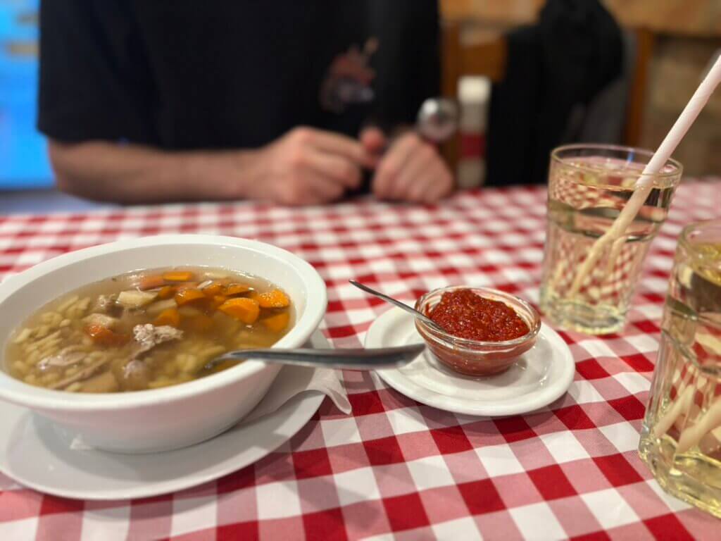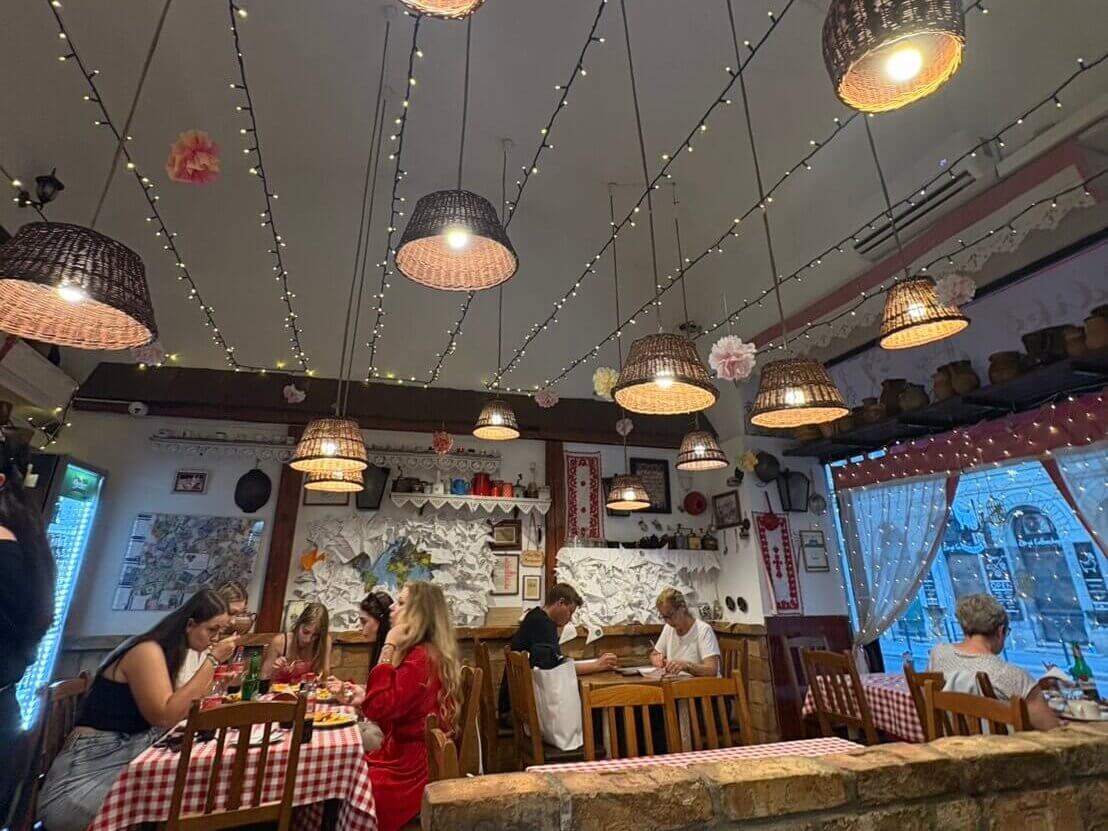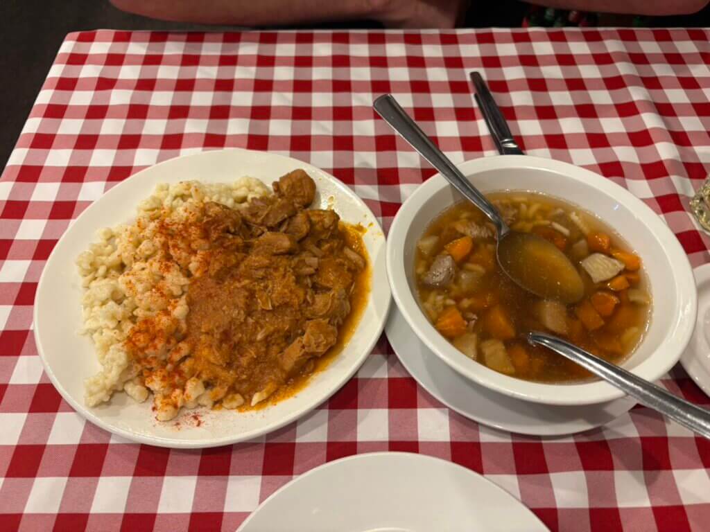 少し早めの夕食で訪れた「Ildikó Konyhája」。ここでもパプリカとポークを煮込んだ料理を注文。ハンガリーらしい素朴な家庭の味が楽しめます。スープも一緒に頼み、2人でシェアする形にしました。前回の反省を活かしてちょうど良い量に。お店の人が持ってきてくれたパプリカソースをスープに入れたら…かなり辛かったです🌶️