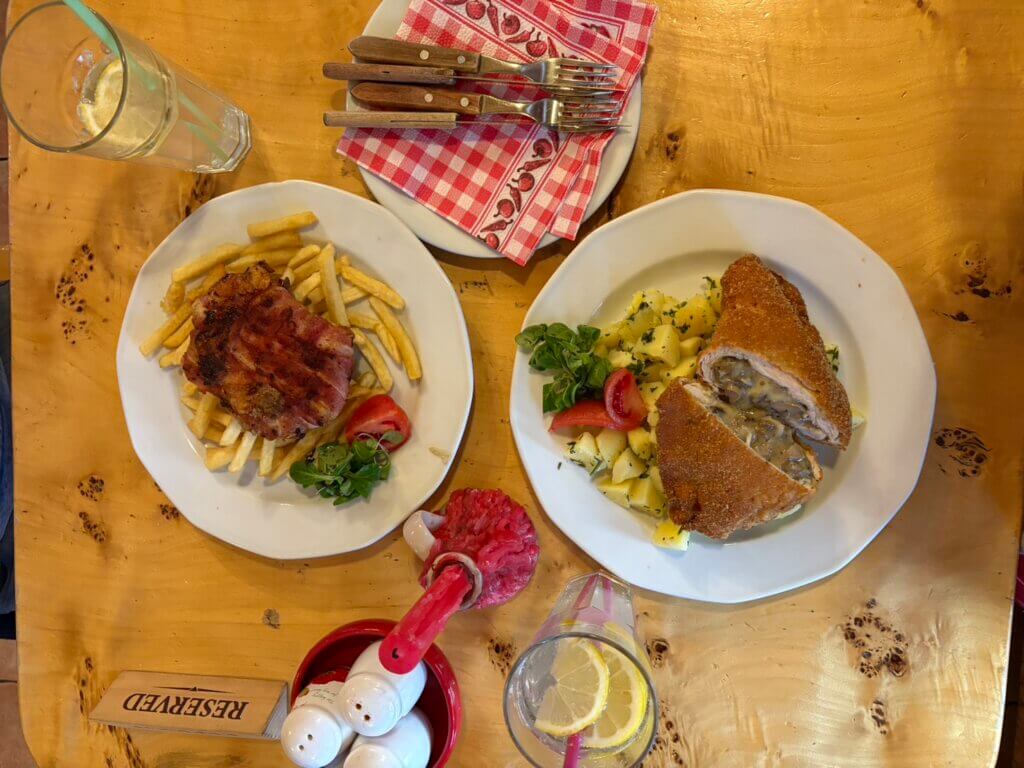 地元の人にも人気のレストラン「Paprika Vendéglő」では、ボリュームに驚かされました! 注文したのは、 キノコとチーズを詰めた七面鳥の胸肉と 鶏むね肉とフライドポテト。