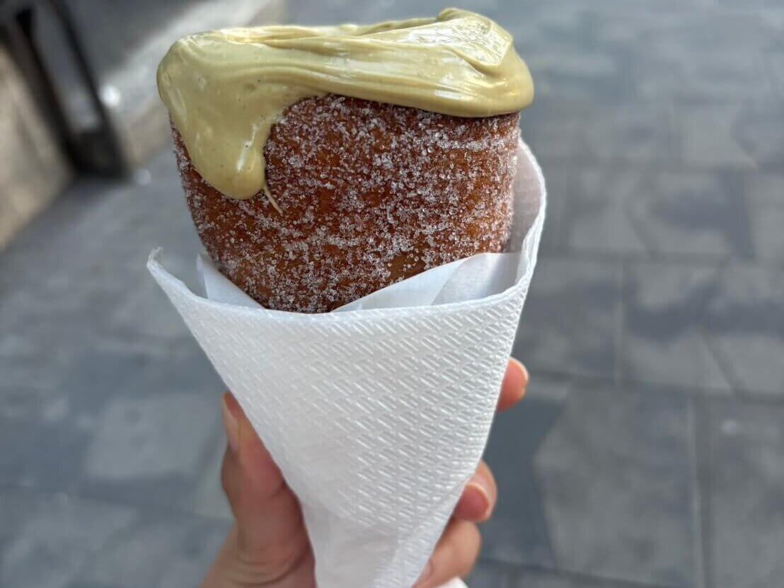 露店で購入した「クラフィン」は、クロワッサンとマフィンの中間のようなスイーツ。ピスタチオクリームが中にたっぷり入っていて、外はサクッと香ばしい。私は目に入った路面店で買いましたが作りたてでおいしく、値段も有名店よりかなり安かったです!